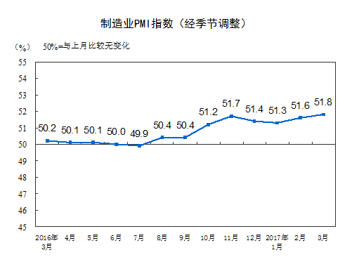 中國經濟網北京3月31日訊 據國家統計局網站消息,2017年3月份,中國制造業采購經理指數(PMI)為51.8%,連續兩個月上升,高于上月0.2個百分點,制造業持續保持穩中向好的態勢。