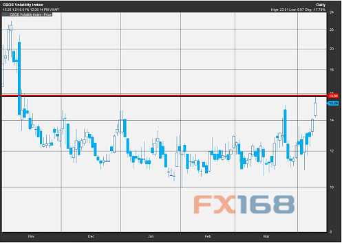 根據FactSet數據,周二CBOE波動性指數升至15.88,創下去年11月11日以來最高水平。該指數在去年11月4日曾飆升至23.01。