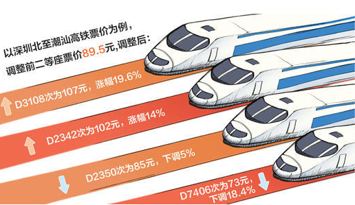 那么調價就是漲價嗎?其實并不是。工作人員介紹說,以深圳北至潮汕的高鐵票價為例,調整前二等座執行票價為89.5元,調整后同樣區間,D3108次為107元,漲幅19.6%;D2342次為102元,漲幅14%;D2350次為85元,下調5%;D7406次為73元,下調18.4%。