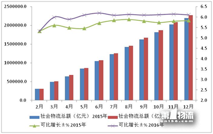 2016年,全國社會物流總額229.7萬億元,按可比價格計算,比上年增長6.1%,增速比上年提高0.3個百分點。分季度看,一季度50.7萬億元,上半年107.0萬億元,前三季度167.4萬億元,比上年同期增長6.0%,6.2%,6.1%,增速比上年同期分別提高0.4個百分點,0.5個,0.3個百分點。總體來看,全年社會物流總額呈現穩中有升的發展態勢,物流需求結構持續改善。