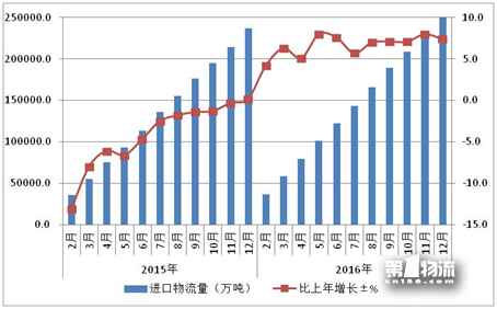 ---進口物流需求增速逐季回穩。2016年進口物流總額同比增長7.1%,增速比上年提高6.9個百分點。從各季度情況看,一季度增長6.3%,上半年增長7.6%,前三季度增長7.1%,全年增速呈現前低后高、逐季回穩的向好態勢。