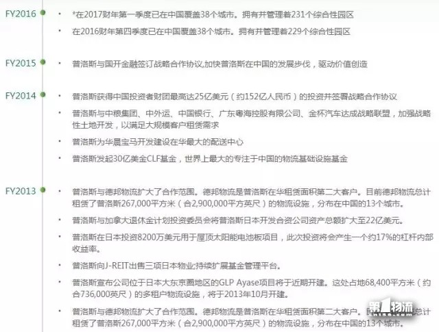 普洛斯致力于為全球最具活力的制造商、零售商和第三方物流公司不斷提高供應鏈效率,達成戰略拓展目標;通過全面的開發、運營、基金管理和金融服務,促進領先的物流生態圈發展。其主要發展歷程及合作項目如下: