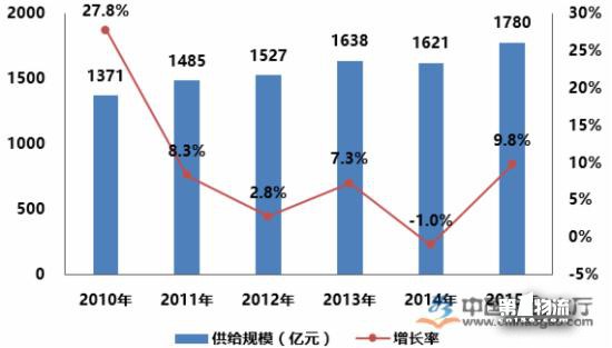 2010-2015年間中國商用冷鏈市場規模整體處于上升態勢,供給規模從2010年的1371億元增長至2015年的1780億元;但是,2010-2015年期間,中國商用冷鏈供給規模增長率波動較大,其中2014年的供給規模下降1.0%,商用冷鏈供給規模的下降主要是由商用冷柜等相關產品供給規模下跌導致。