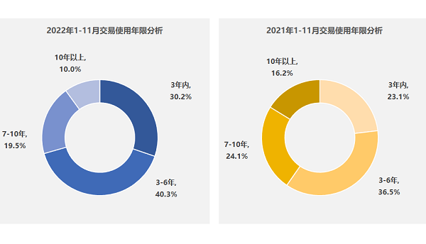 除銷量外,二手車的保值率也是繞不開的話題。由于二手車年限特征明顯,車齡對車價影響較大。從消費者偏好看,2022年1-11月,3-6年車齡的二手車交易占比40.3%,3年內車齡二手車占比30.2%。新能源方面,4年以內車齡二手車占比更是達到80%以上。